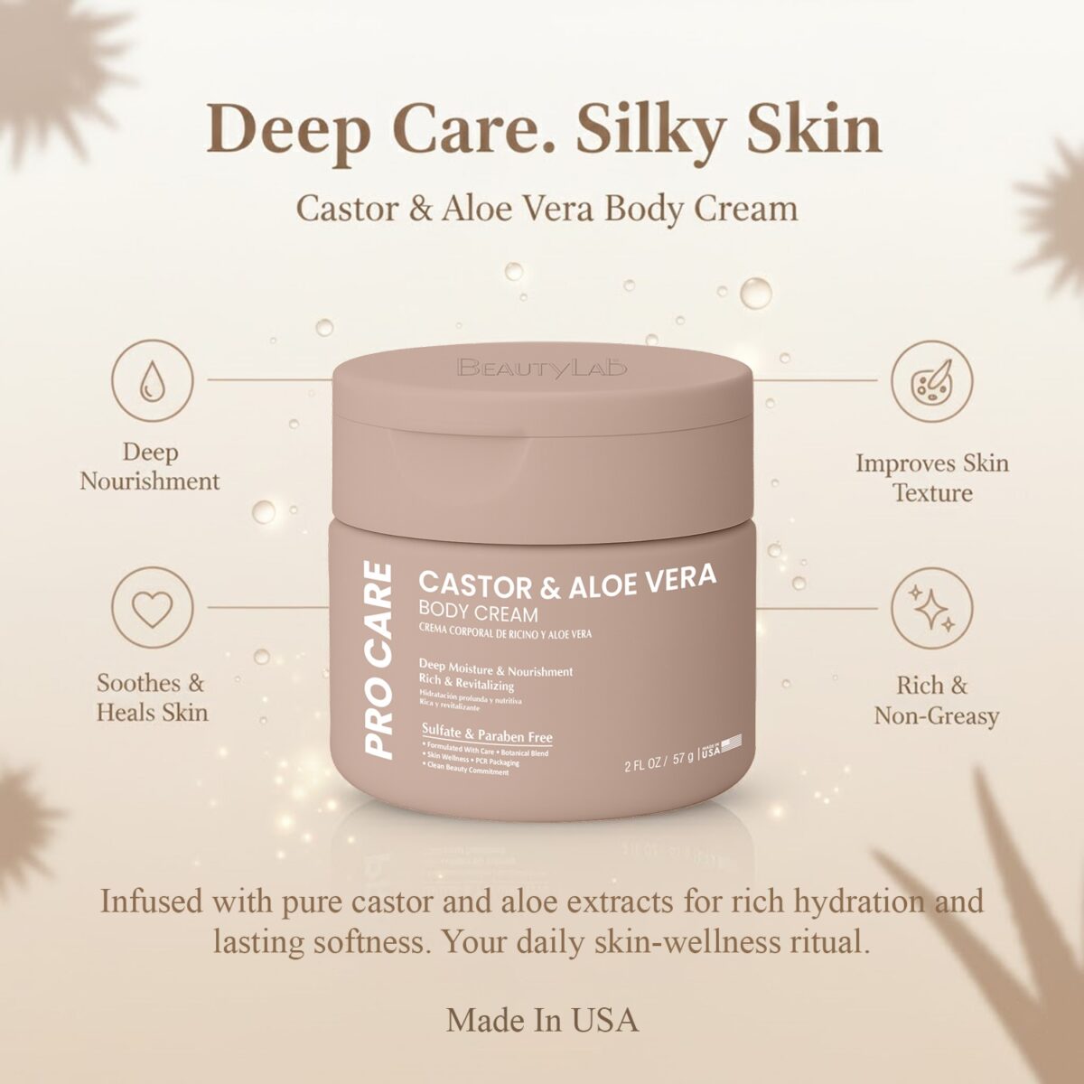 Travel-friendly moisturizing cream created for quick hydration and skin nourishment. Castor Oil enhances softness and elasticity, while Aloe Vera delivers cooling, calming moisture to refresh the skin. Its compact 2oz size makes it ideal for handbags, travel, and on-the-go touch-ups. Keeps the skin hydrated, smooth, and refreshed wherever you are.